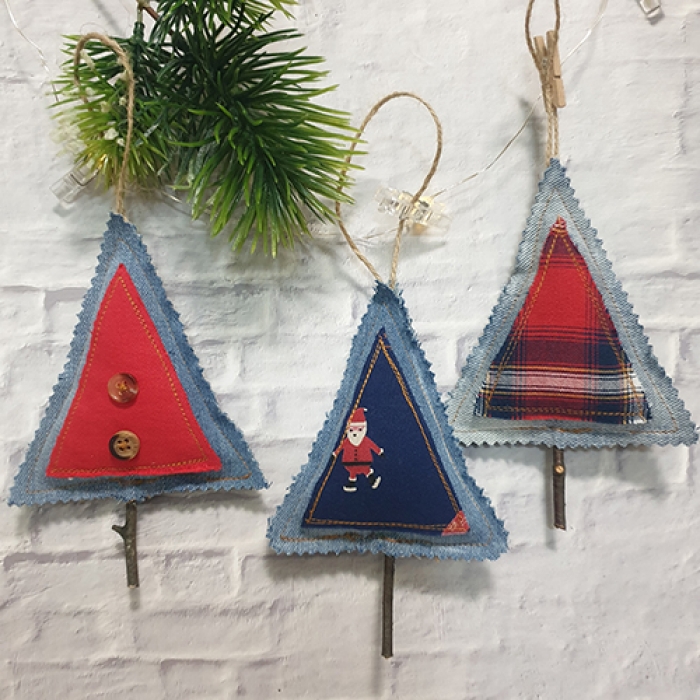 A unique set of 3 Christmas tree created from upcycled denim jeans.
