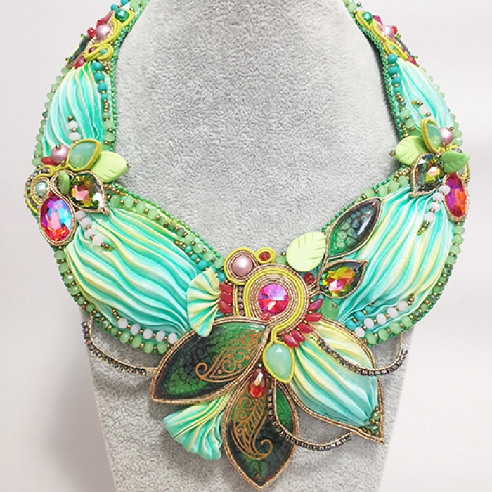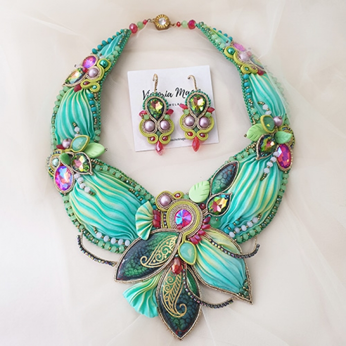 One of a kind bead embroidered set necklace and earrings, made of shibori ribbon, soutache elements, handmade cabochons, crystals, сrystal beads, сzech beads, was made by mixing two techniques: the Soutache and bead embroidery with silk shibori. This necklace is hand sewn bead to bead and this required hours and hours of careful and precise work.