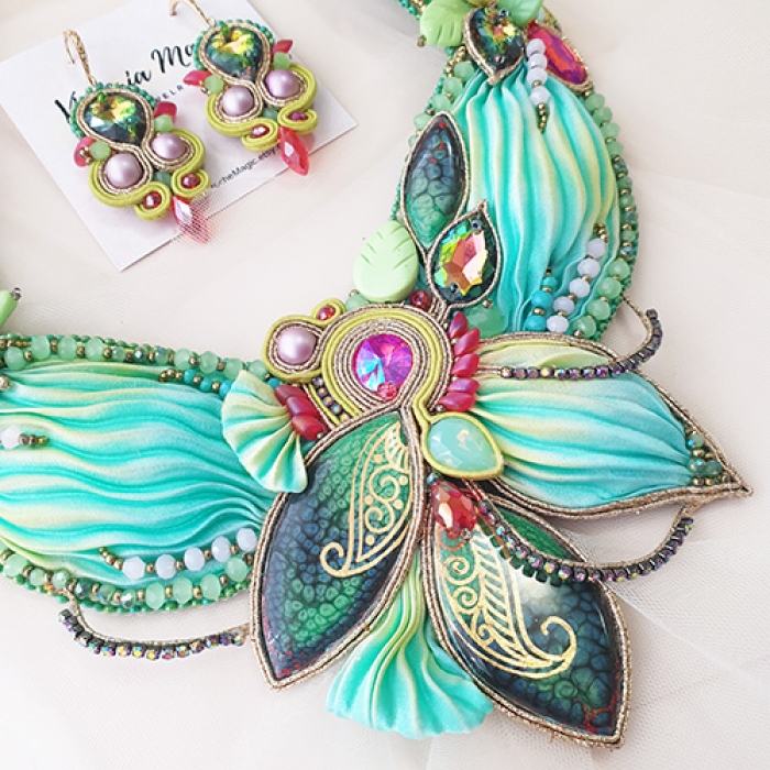 Tags: Shibori necklace, Shibori set, Soutache necklace, One of a kind jewelry set, Statement necklace, OOAK, Green necklace, Beaded Necklaces, Soutache embroidery