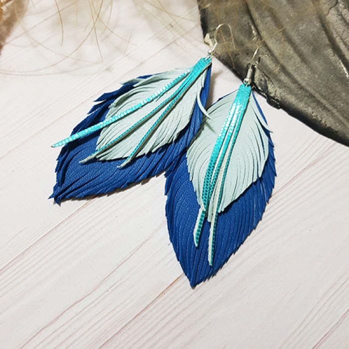 Tags: Double Feathers Leather Earrings, Leather feathers earrings, Leather Earrings, Feathers earrings, Boho Earrings, Lightweight earrings, Eco-friendly, Recycled Leather, blue feathers earrings