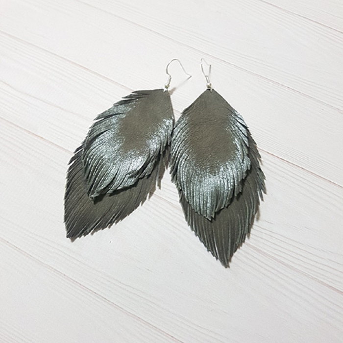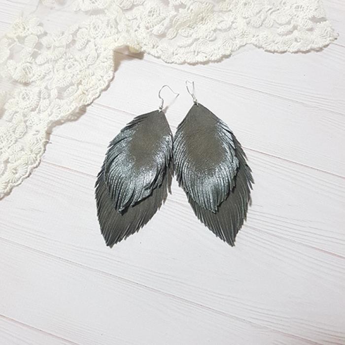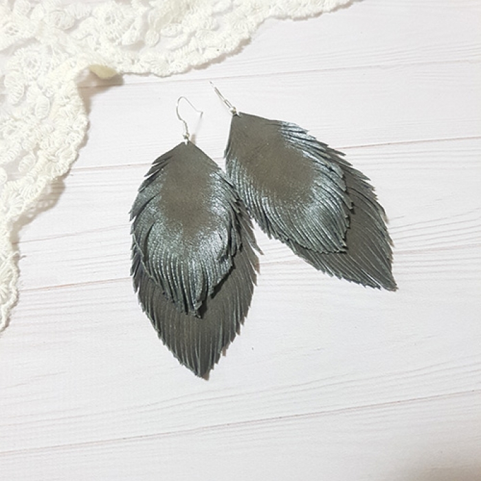 Tags: Double Feathers Leather Earrings, Leather feathers earrings, Leather Earrings, Feathers earrings, Boho Earrings, Lightweight earrings, Eco-friendly, Recycled Leather, Gray feathers earrings